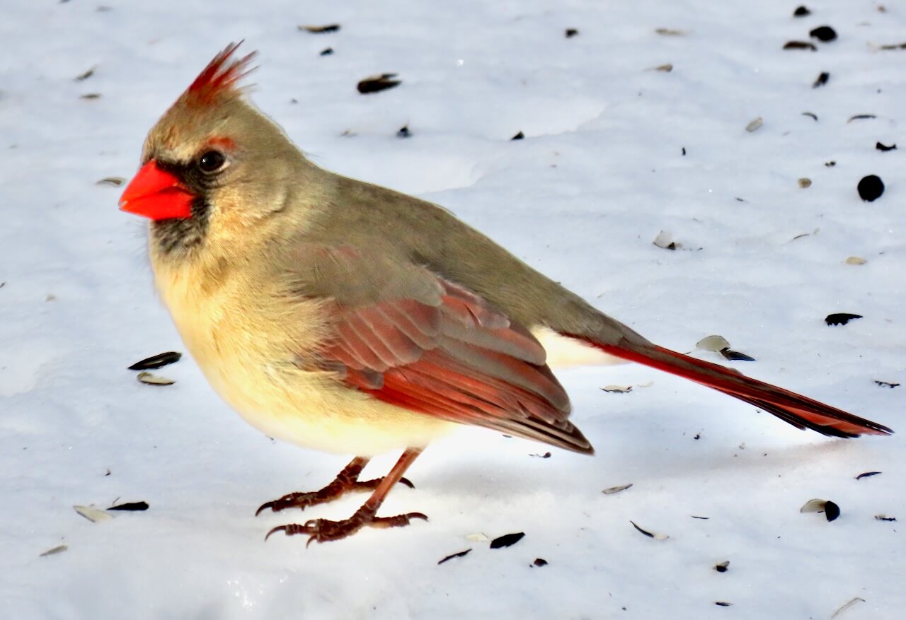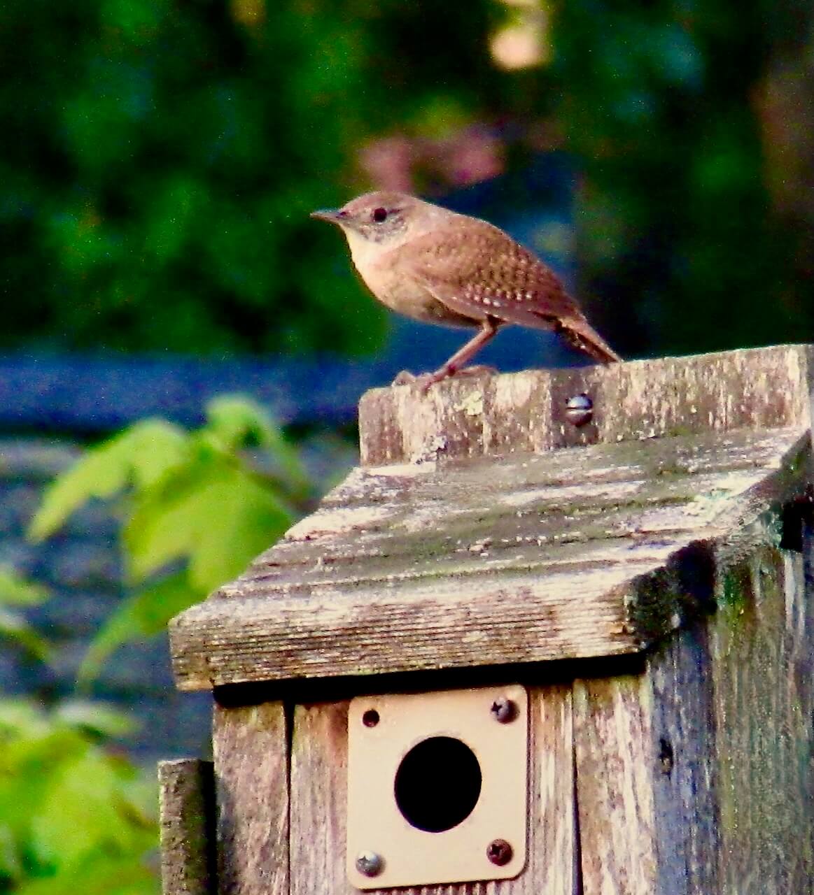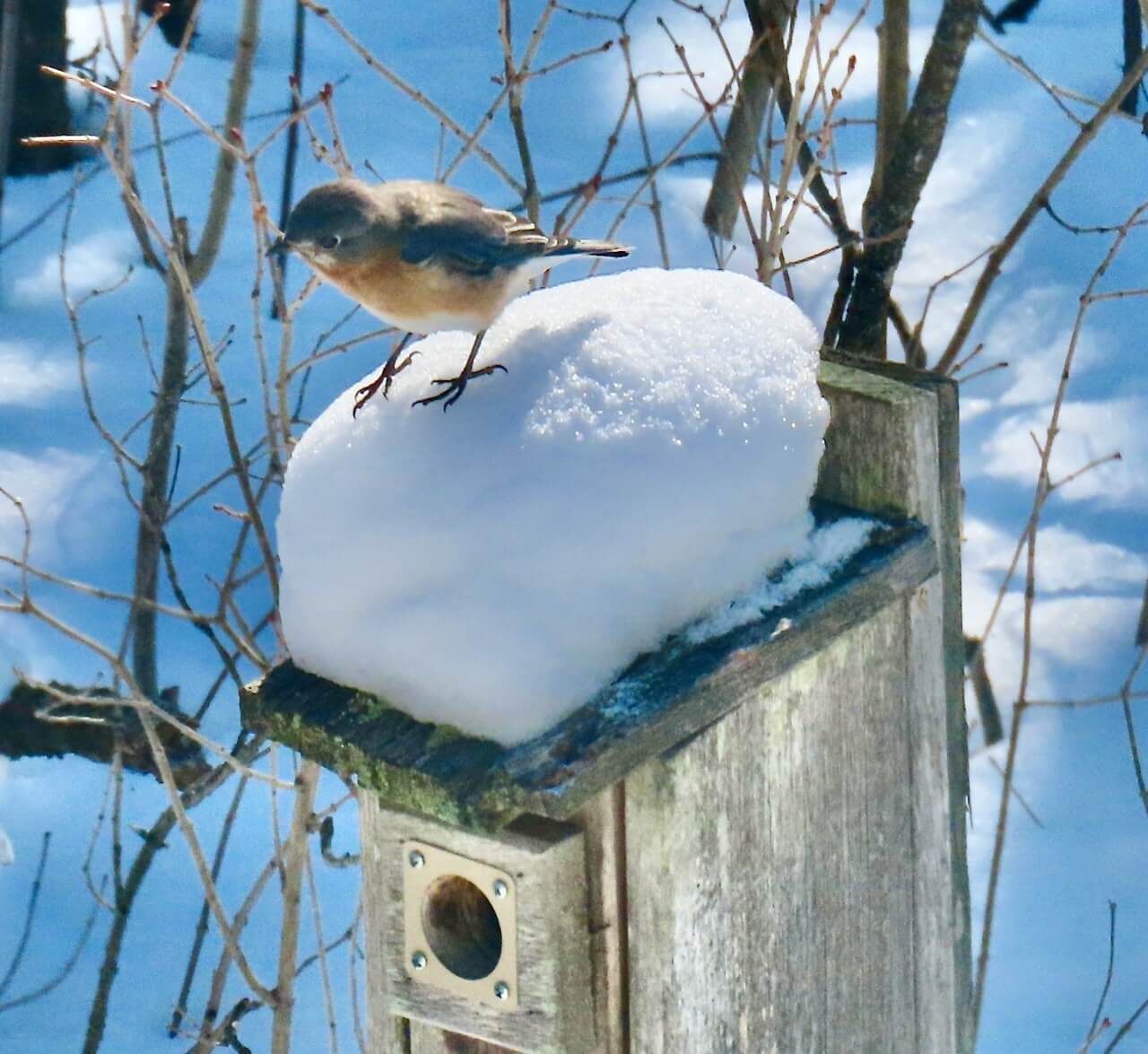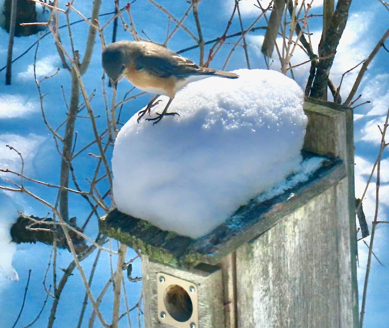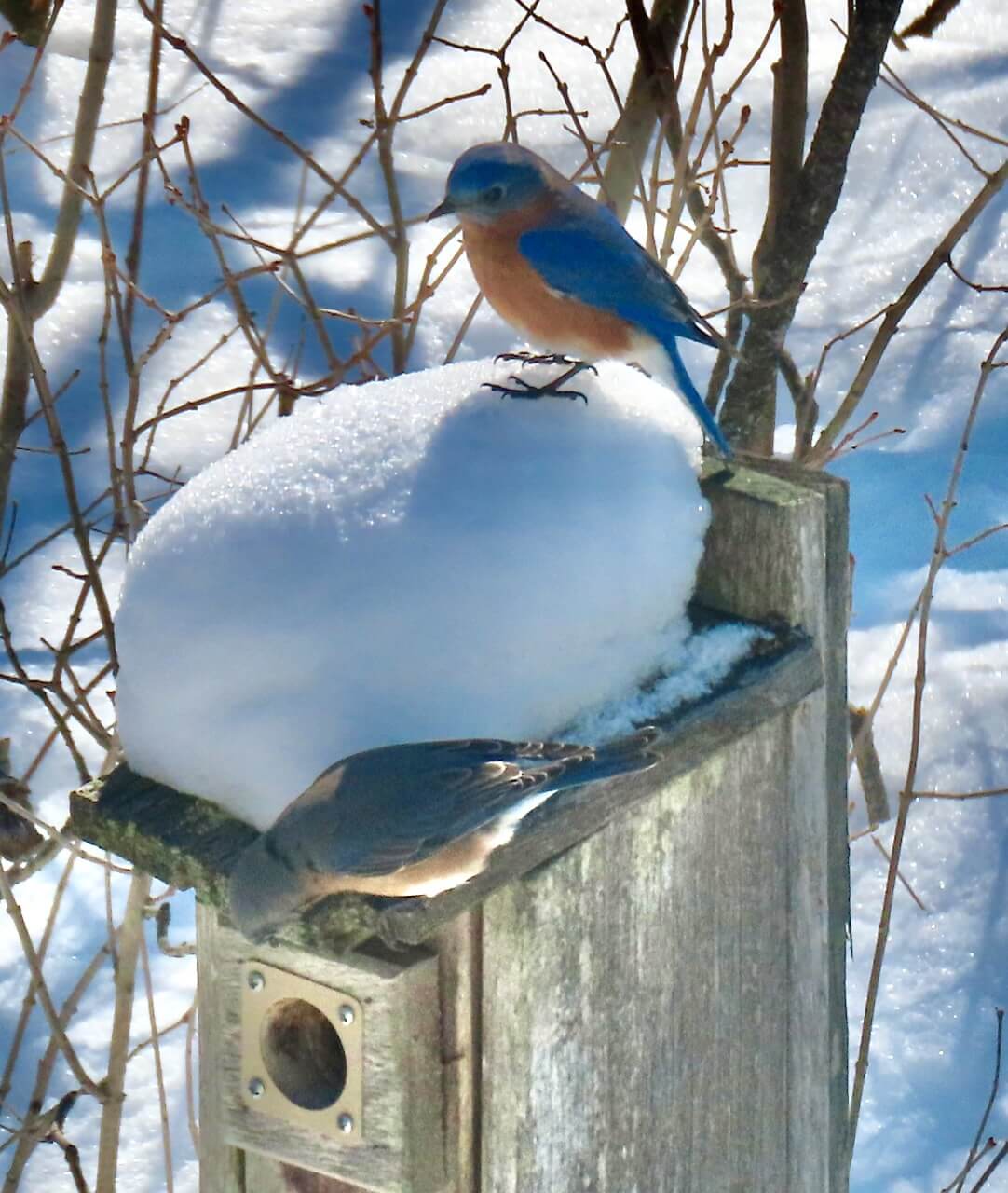 A pair of Eastern Bluebirds brightened up my snowy yard on a gray morning. The specially designed bluebird house installed for them has an opening of exactly 1.5 inches in diameter to ensure that larger birds cannot nest there. Although bluebirds often visit, and occasionally start to build a nest, they never stay through the whole season. After territorial skirmishes sparrows win out. Fingers crossed for this spring!