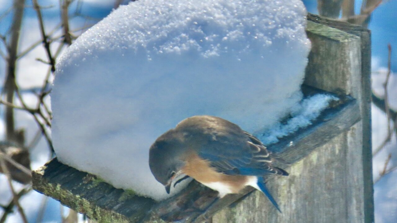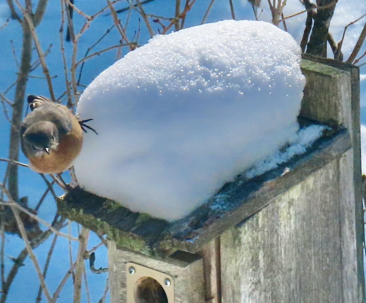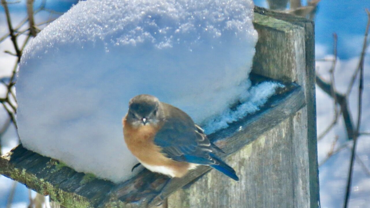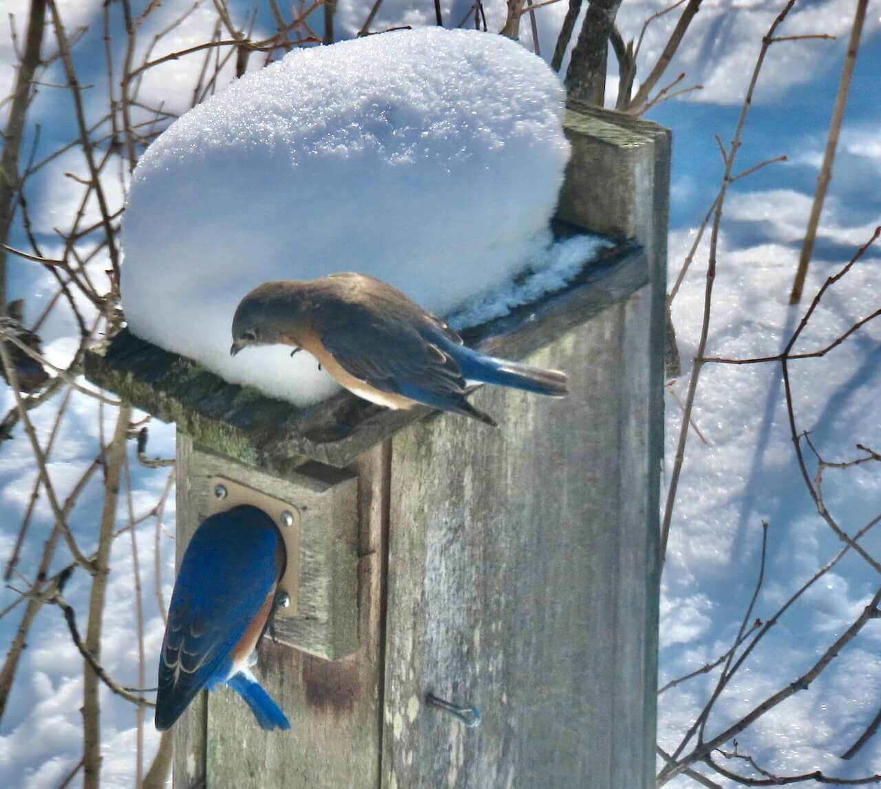 Undaunted by a snow-laden roof after a blizzard, eastern bluebirds continued home furnishing in my yard today.