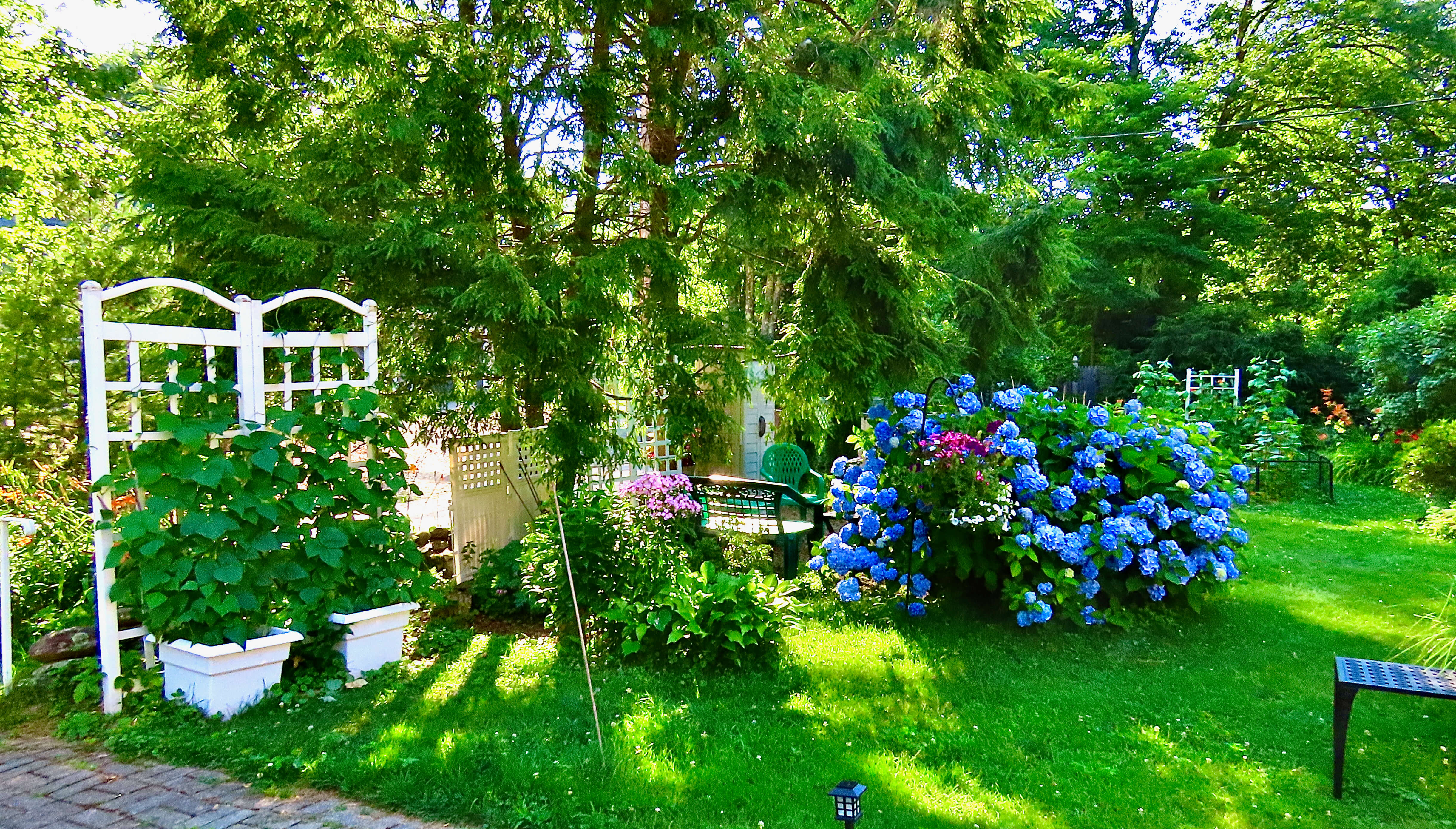 Hydrangeas lend a “secret garden feel ” to this conversation area.Tall phlox provide a shelter for solitary meditation.This wooden bench folds for winter storage. A just-picked garlic crop dries beside it on an all season table.Coleus and evergreens stay cool in the shadier area near the road where neighbors walk by or come to visit.The hand made wooden bench in the zen garden was fashioned from recycled stair steps. It is a perfect place for reflection.There is room under the apple tree for picnics and conversation. Potted young plants enjoy the shade, as well. Gardening celebrates life and growth!